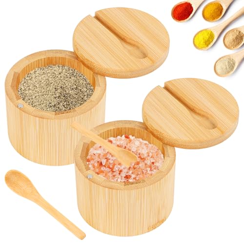 DAKLUNAR Lot de 2 boîtes à sel en bambou avec couvercle magnétique et 6 cuillères, bocal à épices en bois naturel, couvercle pivotant pour le rangement, boîte de rangement à épices, 6 oz