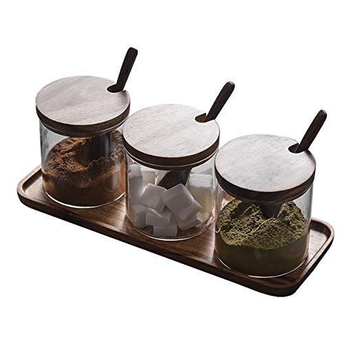 TentHome Pots en Verre à Épices 3 Bocaux en Verre à Condiments avec Cuillères en Bois et Étagère pour Cuisine