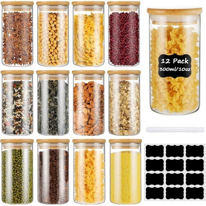 Bocaux en Verre Lot de 12 Pot a Epices en Verre Bocal Epices avec Couvercle en Bambou Bocaux Rangement Cuisine Verre Bocaux