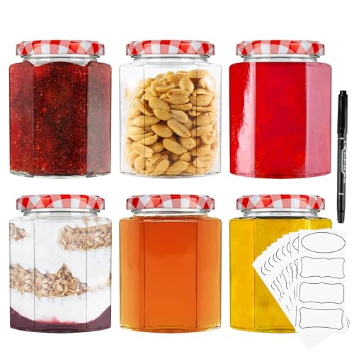HEFTMAN Lot de 6 petits bocaux en verre avec couvercles, hermétiques, 250 ml, bocaux à confiture avec couvercle rouge en gingham, à utiliser comme bocaux de mise en conserve, bocaux en verre pour la