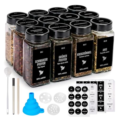 Boic 12 Pièces Pot A Epices En Verre, 120 Ml Bocaux À Épices Avec Étiquettes Allemandes Et Étiquettes Vierges, Boite À Épices Avec Entonnoir, Brosse, Stylo Pour Cuisine Rangement, Noir
