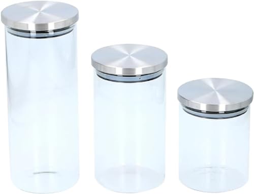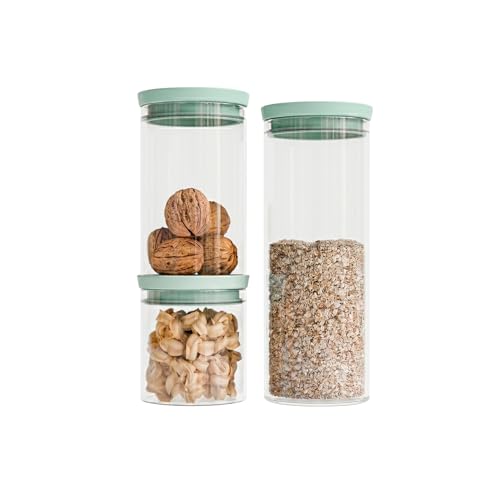 Amig - Lot de 3 bocaux hermétiques ronds avec couvercle vert - Capacités : 600 ml, 1300 ml et 1900 ml - 3 pièces de bocaux en verre pour aliments - Pour épices et pâtes