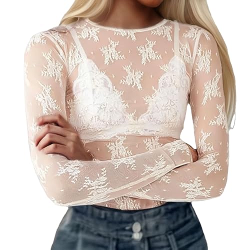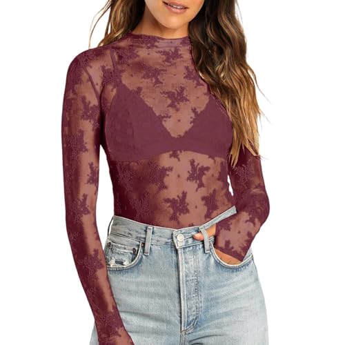 Haut transparent pour femme - Haut élégant en maille - Manches longues - Chemisier Dirndl rouge - T-shirt sexy à manches longues - Body en dentelle chic - Tenue de fête sexy