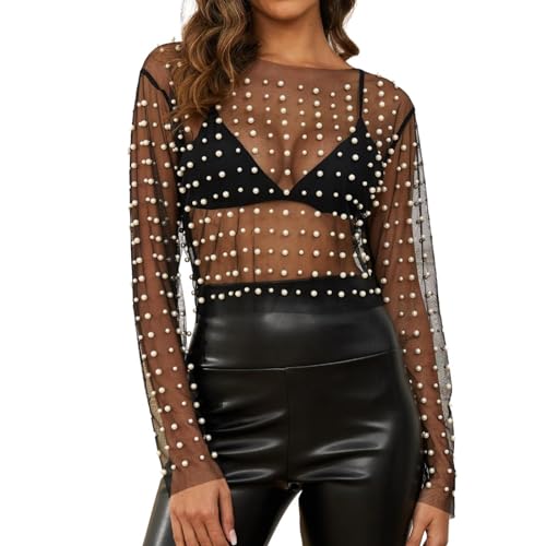 Haut transparent - Haut en maille transparente pour femme - Body en maille - Sexy et élégant - Paillettes - Sexy - Rouge à paillettes - Noir