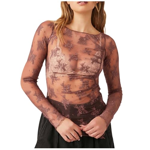 Haut transparent pour femme - Chemisier élégant en dentelle - Haut sexy à manches longues - Y2k - Top en maille - T-shirt à manches longues - Élégant - Body chic - Pour fête - Marron - Chemisier en