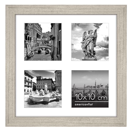 Americanflat Cadre photo collage 25,4 x 25,4 cm en bois flotté avec quatre ouvertures de 10,2 x 10,2 cm – Bois composite avec verre incassable – Formats horizontaux et verticaux pour mur et table