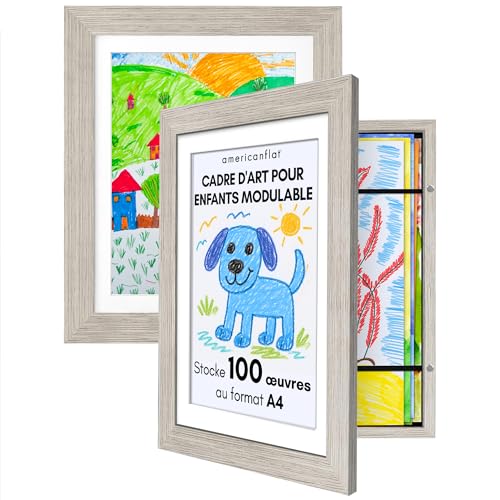 Americanflat Cadre Dessin Enfant à Changer A4 Bois Flotté avec Passe-Partout et 25,5 x 32 cm sans Passe-Partout - Cadres avec Ouverture Frontale Pouvant Contenir 100 Pièces - Lot de 2