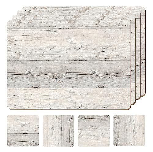 Moderry Lot de 4 Sets de Table en liège résistants à la Chaleur pour Table de Salle à Manger avec Lot de 4 Dessous de Verre Assortis imprimés en Bois de liège 40,6 x 30,5 cm (Bois flotté Blanc)