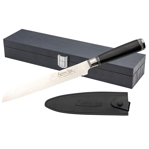 Katana Saya Couteau à pain 20 cm, acier inoxydable Damas VG-10 67 couches, manche en bois de pakka,