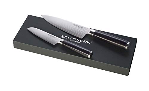 ECHTWERK Ensemble de couteaux damassés, 2 pcs, couteau de chef/couteau de cuisine, couteau Santoku, acier damassé, tranchant lisse, manche ergonomique en bois de Pakka