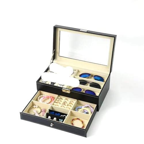 QAZWZG Boîte de 6 Montres et 3 Lunettes Soleil avec présentoir à Bijoux, Organisateur Double Couche for Hommes Femmes pour Rangement(Black)
