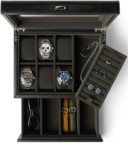 TAWBURY Boîte à montres et bijoux pour homme – Boîtier de montre à 6 emplacements avec affichage en verre, boutons de manchette, support de bague amovible et tiroir personnalisable pour rangement de