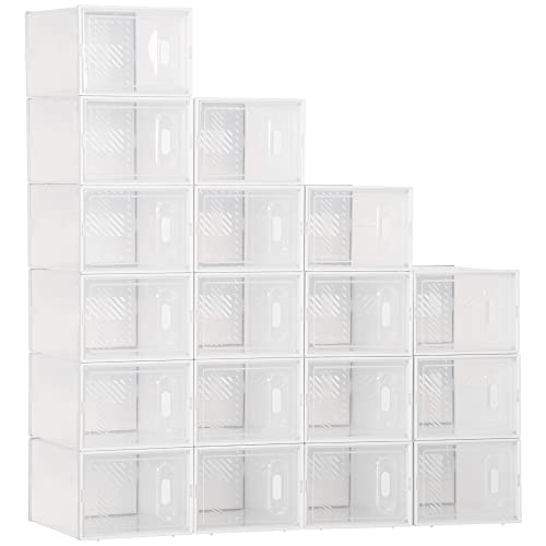 SONGMICS Boîtes à Chaussures, Organisateurs en Plastique, avec Porte, Lot de 18, Empilables, Montage Facile, 33,2 x 23 x 14,5 cm, pour Pointure jusqu'à 43, Transparentes et Blanc Nuage LSP318W01
