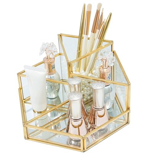 HARLIANGXY - Organisateur de maquillage – Organisateur de cosmétiques – Plateau de rangement de beauté – Porte-pinceaux doré – Boîte à maquillage en verre – Plateau décoratif transparent