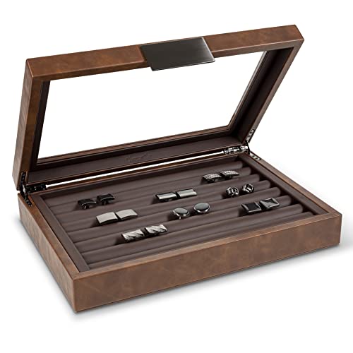 Glenor Co Boîte à boutons de manchette pour homme – Peut contenir 70 boutons de manchette – Boîte à bijoux de luxe – Support à boucle en métal, grand dessus en verre – Cuir synthétique marron