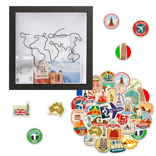 1 tirelire, 50 autocollants pour cartes, carte de voyage, timbres, boîte à cartes avec impression de carte du monde, boîte à souvenir