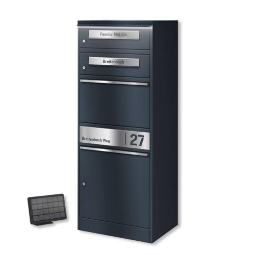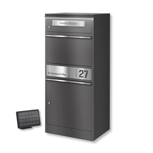 Metzler® boîte aux Lettres Colis multifoyers avec éclairage Solaire LED et Compartiment XL sécurisé Anthracite – gravé | Acier thermolaqué Robuste, plaques INOX personnalisées Bispo 2