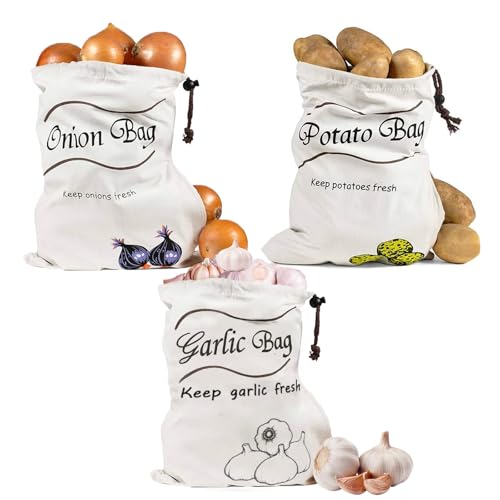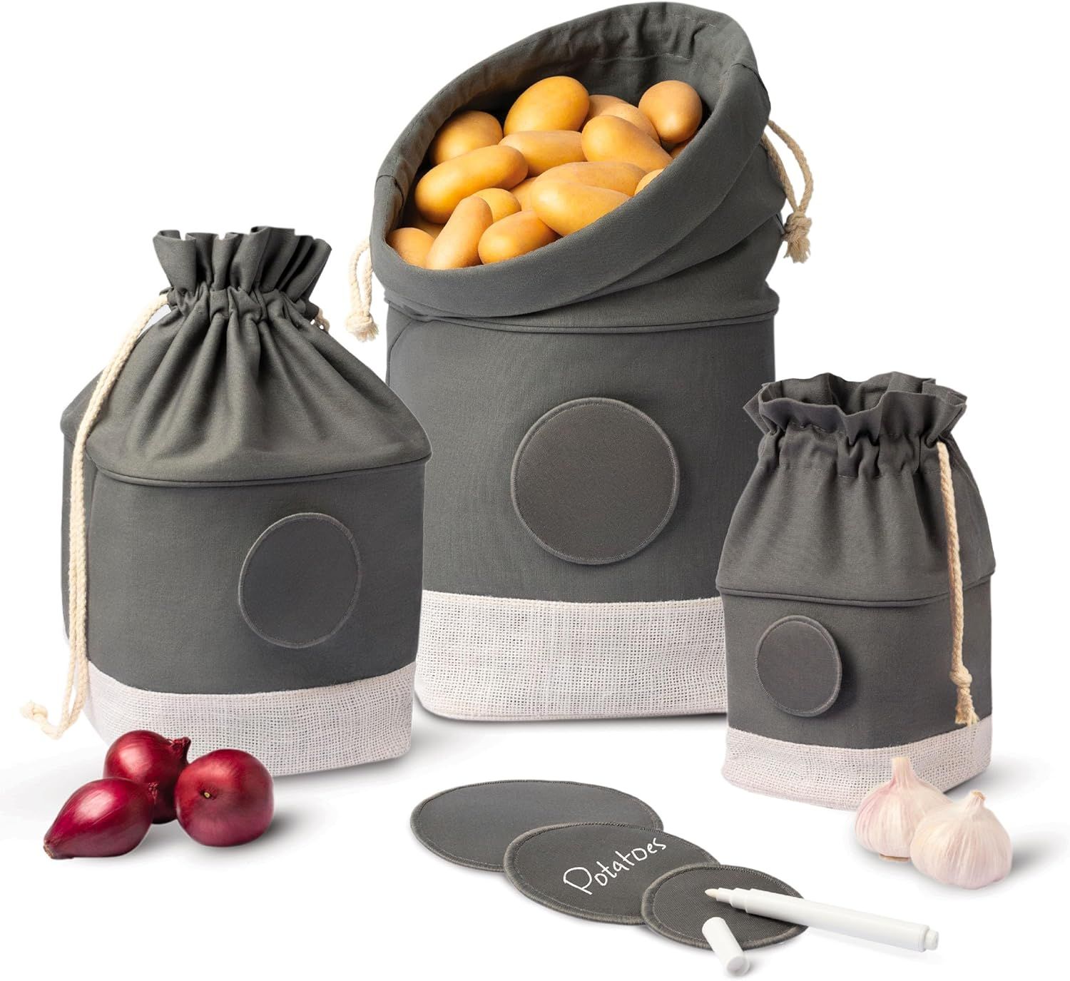 JEXNOVASHOP-Sac de Rangement pour Pomme de Terre - Lot de 3 - Sacs de Conservation Anti-germination en Jute - Respirant & Durable - Stockage Spacieux - Étiquettes & Stylo Inclus