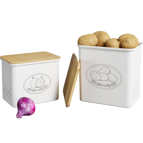 Ecofocet 3 Boîtes Pomme de Terre, Boite de Rangement Cuisine pour Pommes de Terre, Oignons, Ail, Range Legumes Cuisine en Métal avec Couvercle en Bambou, Design Empilable et Aéré (Blanc)
