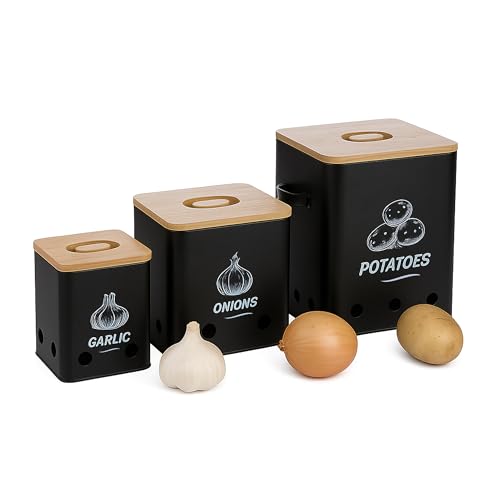 EOPUOZS Lot de 3 Boite Pomme de Terre, Rangement Oignons Ail Pomme de Terre, Bocaux Rangement Cuisine au Design Rétro avec Couvercle en Bambou et Trous de Ventilation (noir)