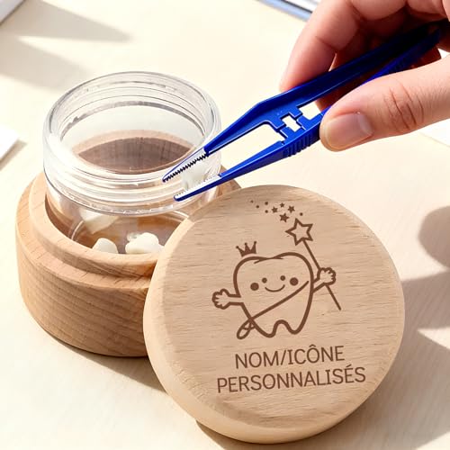 QSZ Boite a Dents de lait Personnalisée Icônes Nom Gravées Personnalisables Bois Boite à Dent de lait Personnalisable Boîte en Acrylique Intégrée Cadeau pour Garçon Fille (boite a dents de lait)
