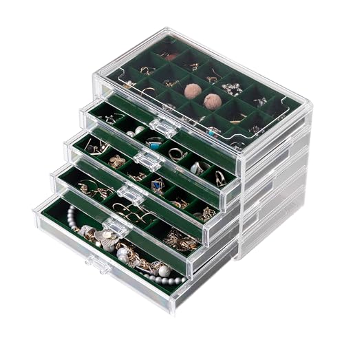 Frebeauty Boîte de rangement en acrylique transparent pour bijoux et boucles d'oreilles avec 5 tiroirs et plateaux en velours pour femme - Pour bagues et clous d'oreilles, vert noirâtre