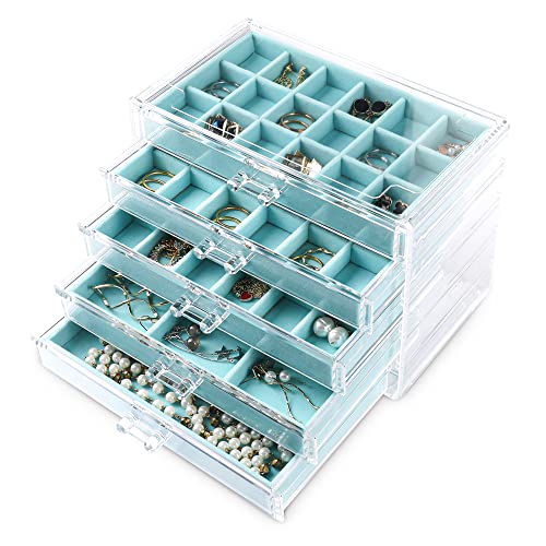 Frebeauty - Boîte de rangement en acrylique transparent pour bijoux et boucles d'oreilles avec 5 tiroirs et plateaux en velours pour femme, pour bagues et clous d'oreilles, turquoise