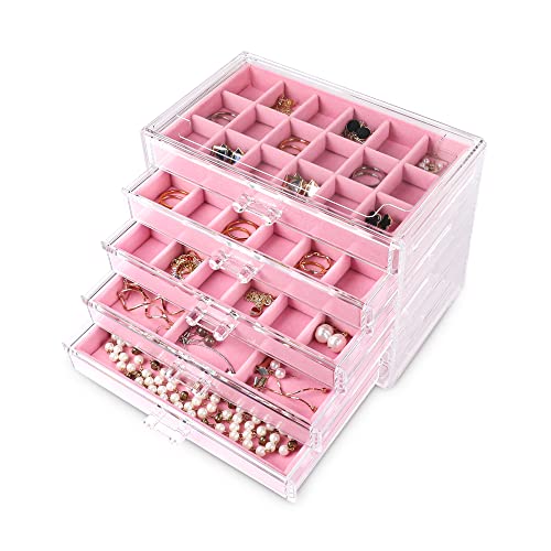 misaya Organiseur de bijoux avec 5 tiroirs, cadeau d'anniversaire et de Noël, boîte à bijoux en acrylique transparent pour femme, présentoir de boucles d'oreilles en velours pour boucles d'oreilles,
