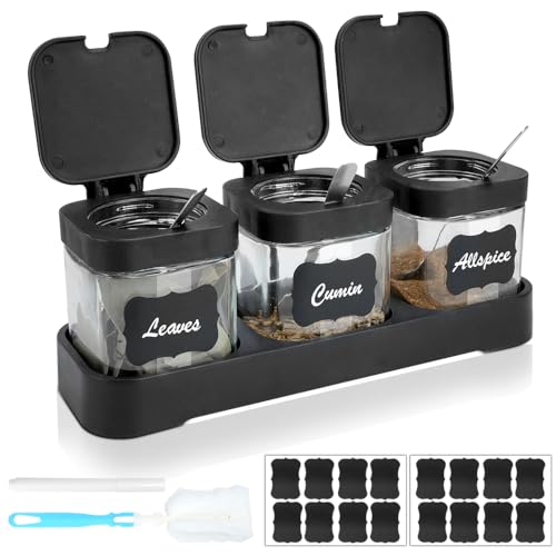 MOAMUN 3 Pot a Epices En Verre, Bocaux à Épices Carrée Transparente avec Plateau, Couvercles, Cuillères, Étiquettes, Stylo et Pinceau, Boite a Epice Pour Sucre Sel Graines Épices Herbes (Noir)