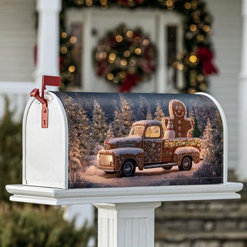 Housse de boîte aux lettres magnétique en forme de bonhomme en pain d'épice pour décoration extérieure de cour, 53,3 x 64,9 cm, motif bonhomme en pain d'épices, arbres recouverts de neige, marron