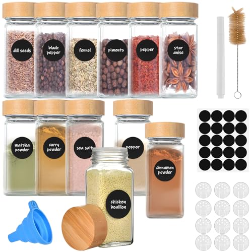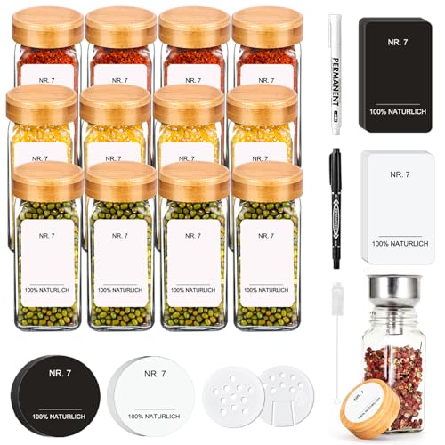 12Pcs Pots à Épices Verre avec Couvercles Bambou, 120ml Boite à Épice Cuisine avec Tamis, Étiquettes, Brosser, Entonnoir, Stylo, Bocal Epices Bocaux Hermetiques Carré pour Rangement Organisation