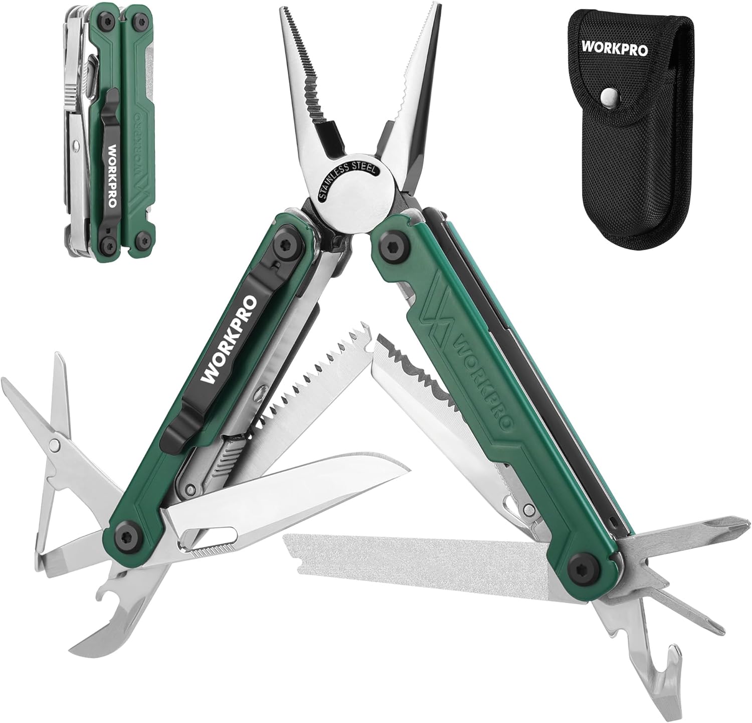 Pince Multifonction en Acier Inoxydable 18 en 1 WORKPRO, Outil Multifonction avec Sac, Multitool Couteau Pince Scie Tournevis Ouvre-Boite pour Exterieur, Camping, Randonnee, Reparation (Vert)