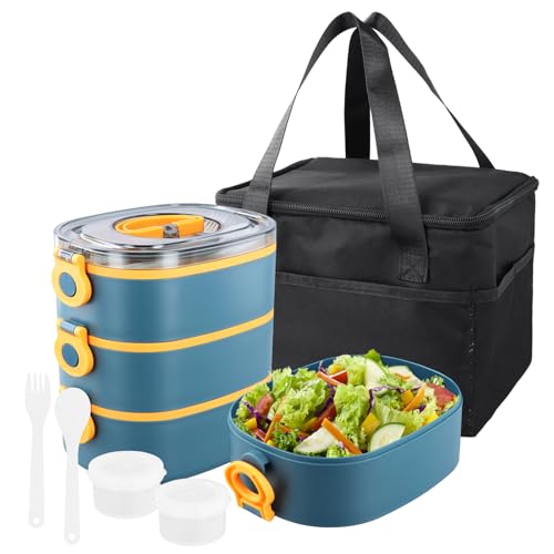 3 en 1 Bento Lunch Box 2800ml, Assiette Compartiment Adulte Empilables avec Lunch Bag Couverts Partition, Boite Repas Micro-Ondable Anti-Fuite Sans BPA, Boîte à Goûter Enfant Travail Ecole (Bleu)