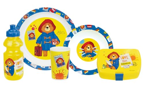 FUN HOUSE | Set Boite Repas Paddington Pour Enfant | 1 Verre, 2 Assiettes + Gourde et Boite Goûter | Licence Officielle | Réutilisable et Micro-ondable | Marque Française | Couleurs VIves |Idée Cadeau
