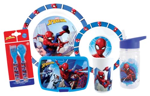 FUN HOUSE | Set Complet Boite Repas Spiderman Pour Enfant | 1 Verre + 2 Assiettes + Couverts + Gourde et Boite Goûter | Licence Officielle |Réutilisable et Micro-ondable |Marque Française |Idée Cadeau