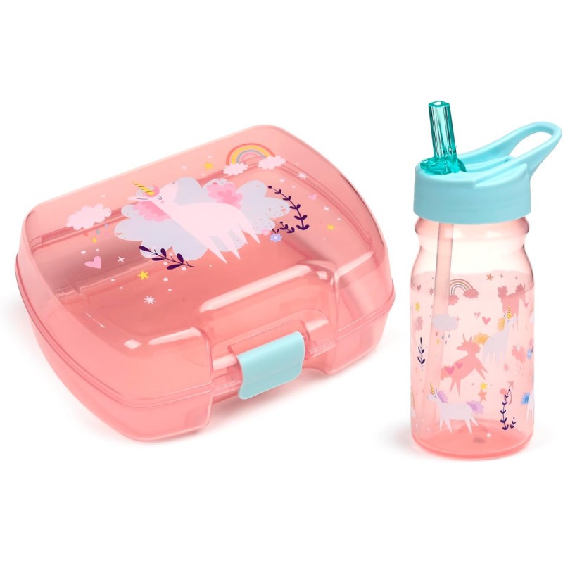 Boite à goûter et gourde avec paille - Licorne - Rose/Bleu - Plastique sans BPA
