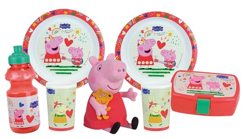 FUN HOUSE | Set Complet Vaisselle Peppa Pig Pour Enfant | 2 Assiettes + 2 Verres + Gourde + Boite Goûter + Peluche 17 Cm | Licence Officielle | Réutilisable | Marque Française | Idée Cadeau