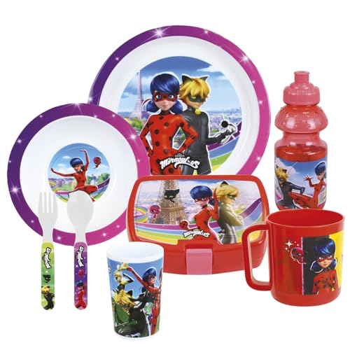 Fun House | Set Vaisselle Miraculous Enfant | Set Couverts + 2 Assiettes + Gourde + Gobelet + Boite à Goûter | Apprentissage Repas | Ladybug | Vaisselle Réutilisable et Micro-Ondable | Cadeau 36 Mois+