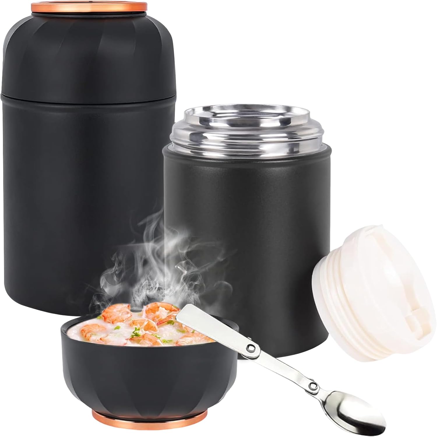 DUNSOO Boite Repas Isotherme, 650ml Vert Boîtes Alimentaires Isothermes, Boîte Isotherme Repas Chaud avec Cuillère Pliante pour Ecole,Bureau,Équitation (Noir)