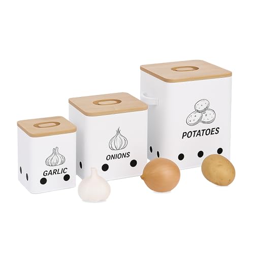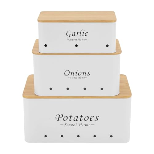 RjcdOPL Boite Pomme de Terre, Lot de 3 Organisateurs de Cuisine Pour Oignons, Pommes de Terre et Ail, Boîtes de Rangement en Acier au Carbone avec Couvercle en Bambou (Blanc)