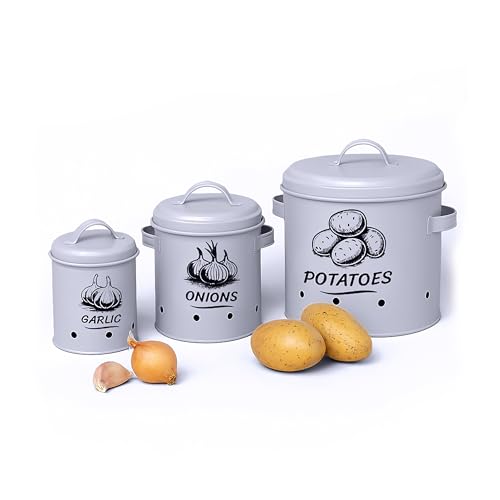 Joejis rangement pomme de terre oignon ail Lot de 3,Métal boite oignons ail echalotte avec couvercle avec circulation d'air à 360°- Rangement Pomme de Terre - Creme