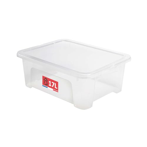 SUNDIS View Box, boîte de rangement en plastique avec couvercle, 17l, transparent, superposable et empilable, idéale pour ranger les armoires, le bureau, la buanderie, la salle de bain