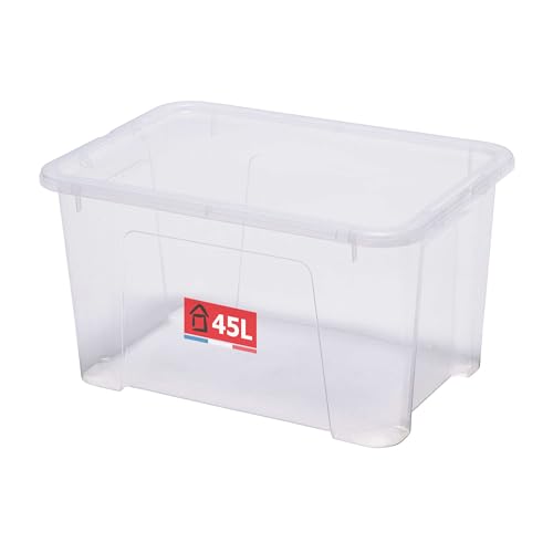 SUNDIS View Box, boîte de rangement en plastique avec couvercle, 45l, transparent, superposable et empilable, multi-usages et idéale pour ranger les jouets, vêtements et documents