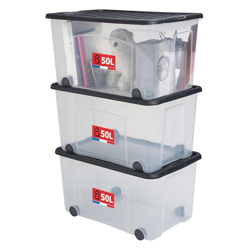 SUNDIS Ventilo, boîte de rangement avec roues, lot de 3, couvercle noir, 50l, en plastique transparent, superposables et empilables, idéales pour ranger la chambre, les jouets, le bureau, le linge