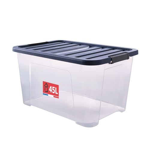 SUNDIS Wave Box, boîte de rangement avec couvercle clipsable 45l, en plastique transparent, superposable et empilable, idéale pour ranger la chambre, les jouets, le bureau ou le grenier