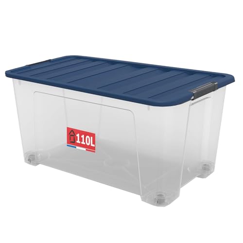 SUNDIS Wave Box, boîte de rangement avec couvercle clipsable 110l, en plastique transparent, superposable et empilable, idéale pour ranger la chambre, les jouets, le bureau ou le grenier