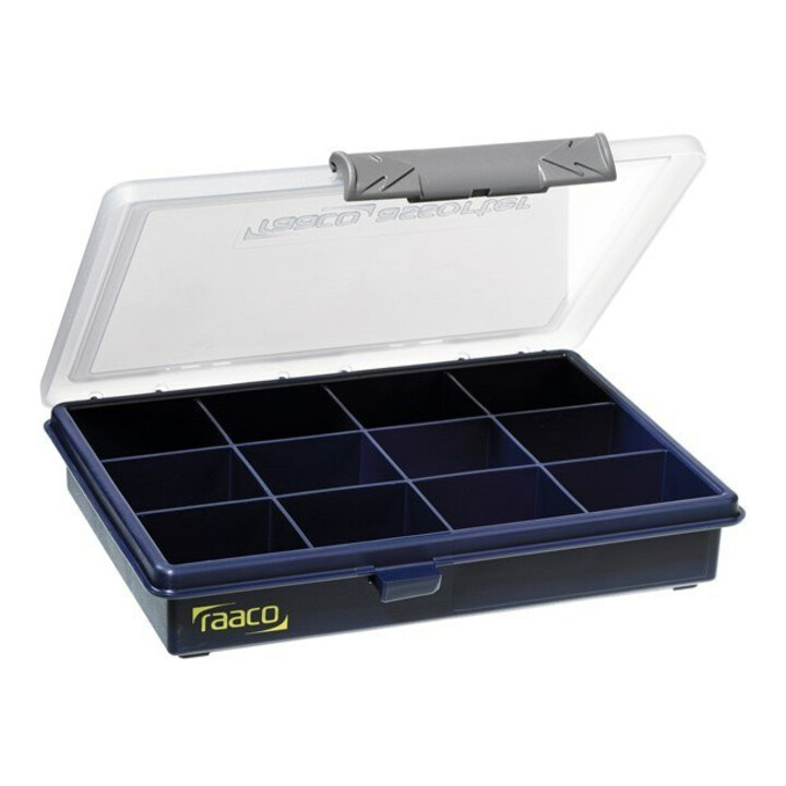 raaco CarryLite 80 4x8-12/DLU: Boîte de rangement Visserie Premium pour Atelier, Couvercle Sandwich, 12 Compartiments, Capacité de 10 kg, Stockage Sécurisé, Portable, 27,8 x 33,7 x 8,2 cm, Boîte à Vis