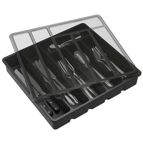 Range Couvert, Range-couvert avec Couvercle, Boîte de Rangement Couverts pour Tiroir Cuisine et Comptoir, Organisateur en Plastique, 6 Compartiments - Cuillère Fourchette Couteaux Grand Noir (Grizzly)