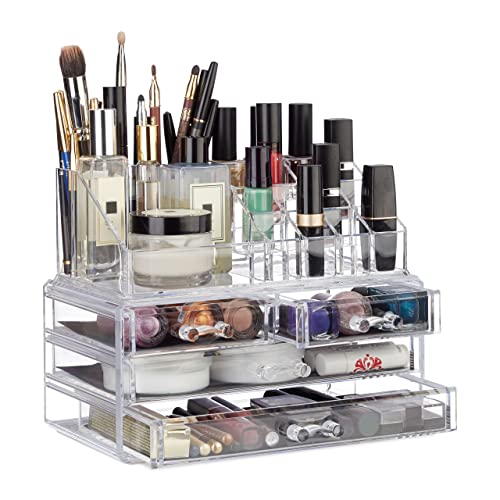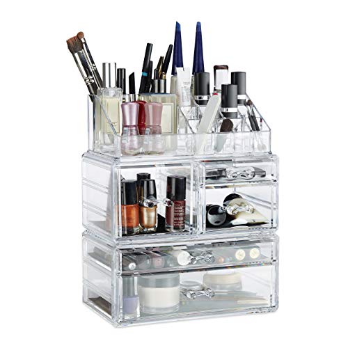 Relaxdays Organisateur cosmétiques 2 parties boîte rangement 4 tiroirs maquillage Make up, transparent