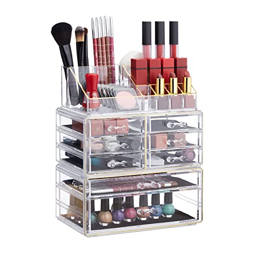 Relaxdays 10023135_1099 Boîte rangement maquillage Make up organisateur cosmétiques tiroirs compartiments, transparent-doré, acrylique, 1
